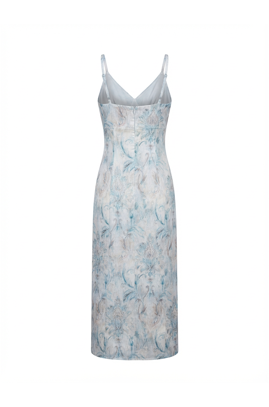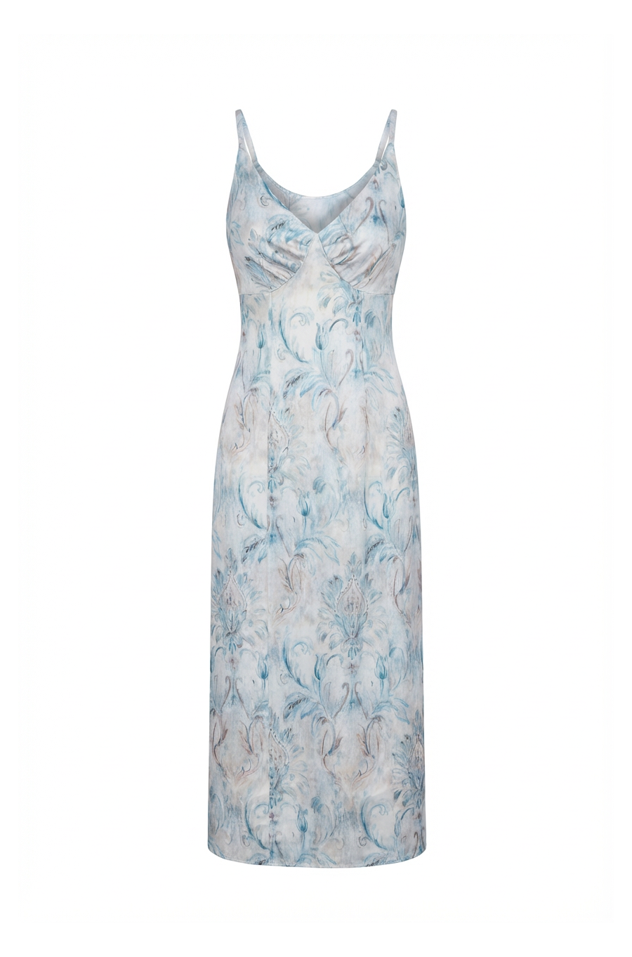 Vestido largo tipo lencero confeccionado en satén estampado William Morris.
